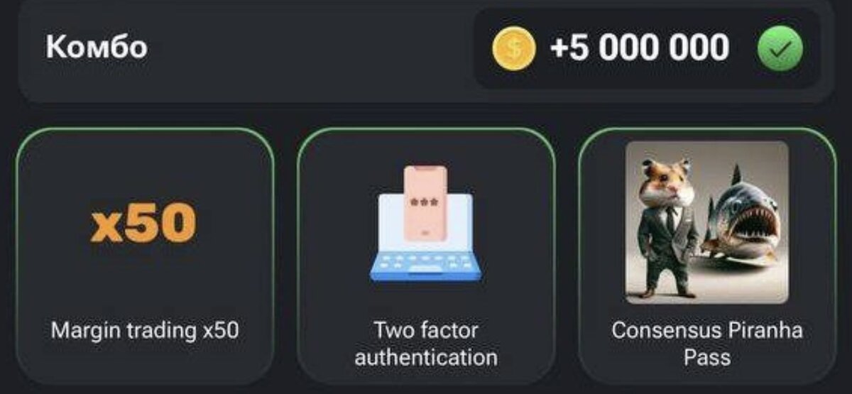 Друзья, сегодня, 26 мая 2024 года, пришло время погрузиться в мир новых комбо карт в игре Hamster Kombat. На сегодняшний день свежие комбинации карт: 1. X50 (Markets) 2.Two factors authentication (PR&Team) 3.Consensus Piranha pass (Special) Эти комбо карты открывают новые возможности для прокачивания вашей фермы , а именно бонус 5КК . Готовьтесь к листингу и прокачивайте свою ферму , ведь с такими бонусами можно быстро достичь хорошего пассивного заработка , всем удачи. Подписывайтесь на мой канал и первыми узнавайте ежедневно о новых Комба картах , ведь они будут обновляться каждые 24 часа Если тебе интересно как быстро на этой игре зарабатывать , то у меня есть пост , где я рассказал о топовых карточках , которые приносят самую большую прибыль. Ссылка на пост :