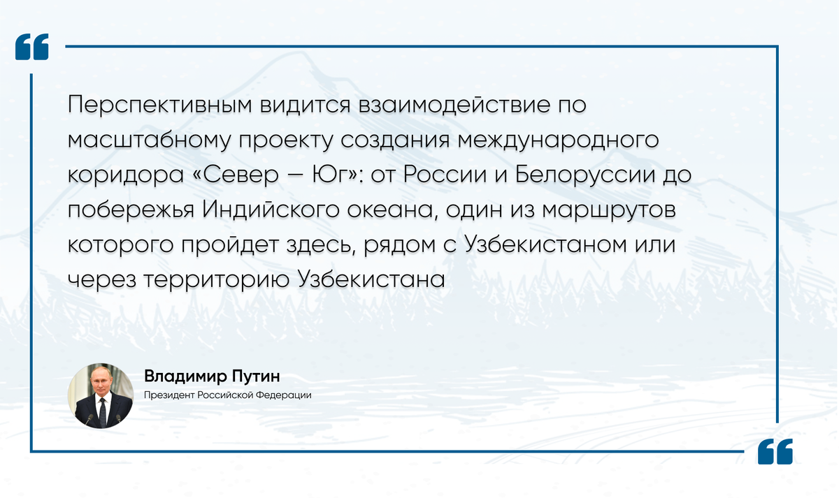 Вопросы логистики стали одними из ключевых на первом заседании Совета регионов России и Узбекистана с участием глав государств Владимира Путина и Шавкат Мирзиеева. В частности, обсуждалось расширение проекта МТК «Север — Юг».
