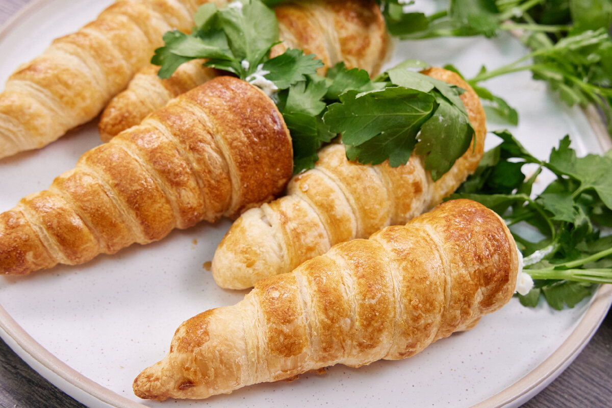 Мята 30 г Понадобится бумага А4, фольга и кондитерские пакеты Приготовление 1. Лист А4 сложить углом к середине листа и отрезать лишний прямоугольник, свернуть двойной треугольник в конус и загнуть края внутрь – зафиксировать. Сделать ещё 5 таких же конусов. А затем завернуть бумажные конусы в фольгу и загнуть края вовнутрь, прижать. 2. Заранее размороженный пласт теста переложить на стол с мукой (20 г) и раскатать скалкой в разные стороны в более тонкий большой пласт теста 3-4 мм толщиной. Нарезать на полоски 6 шт. по 2-2,5 см шириной. 3. Конец полоски из теста прикрепить к кончику конуса и намотать внахлёст по спирали слегка натягивая и двигаясь вниз к широкому краю конуса. А в конце слегка спрессовать край теста. Таким образом сд