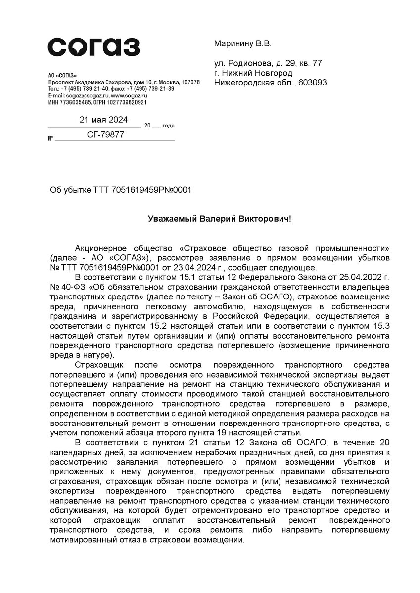 Страховал свой автомобиль по ОСАГО в СК СОГАЗ. При страховании, агенты страховой компании "красиво пели" и гарантировали, что в случае страхового случая, именно их компания, что отличает ее от многих других, выполнит восстановительный ремонт автомобиля после ДТП. Именно этот аргумент был основным при выборе мной страховой компании в которой я страховался по ОСАГО. Произошел страховой случай - ДТП в котором моему автомобилю был нанесен ущерб - разбит задний фонарь, поцарапан бампер, помято заднее крыло (в том числе ребро жесткости). Я обратился в СОГАЗ за возмещением ущерба. По деньгам оценили в 19990 рублей. Смех да и только, так как один только фонарь фирмы DEPO, который был установлен на моем автомобиле, около 5000 рублей стоит. А сколько там "костоправить", а грунтовка, а окраска? Конечно, я выбрал восстановительный ремонт,