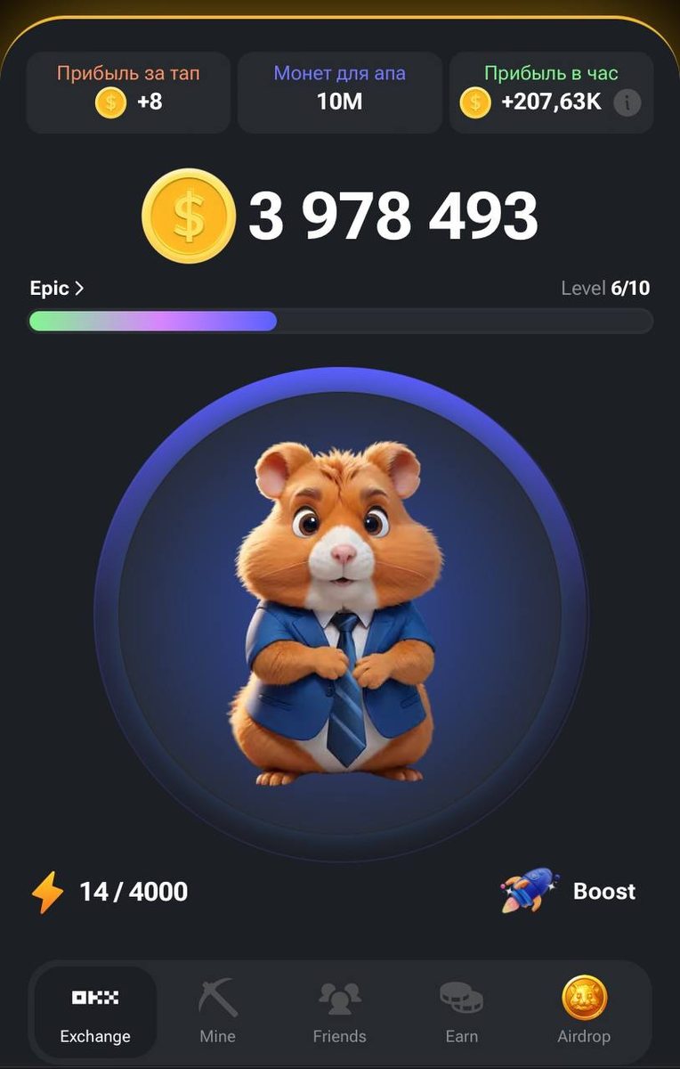 Hamster Kombat — это увлекательная игра в Телеграме, где вы становитесь главой собственной криптовалютной биржи и прокачиваете персонажа Хомяка до максимального уровня. Несмотря на то, что “управлять” здесь ограничивается кликами на кнопку на главном экране, игра предоставляет интересные возможности для заработка монет. > Начать играть Тапать хомячка (или брить) Вначале игры вам придется немного времени потратить на тапанье хомячка, чтобы набрать монетки. Эти монетки вам нужны для того, чтобы покупать карточки в разделе mine. С 3-4 уровня тапанье становится практически бессмысленным. Раздел Earn В разделе вначале игры вы можете сразу подписаться на соц сети хомяка и вам дадут много монет. Например, за подписку на ютуб вам дадут сразу 50.000 монет. Это сразу 3 уровень. На эти монеты вы сможете купить много карточек и повысить доходность в час. Собирайте КОМБО и получи 5.000.000 монет Если вы купите 3 нужные карточки раз в день, то вы соберете комбо и в бонус получите 5.000.000 монет. Эт