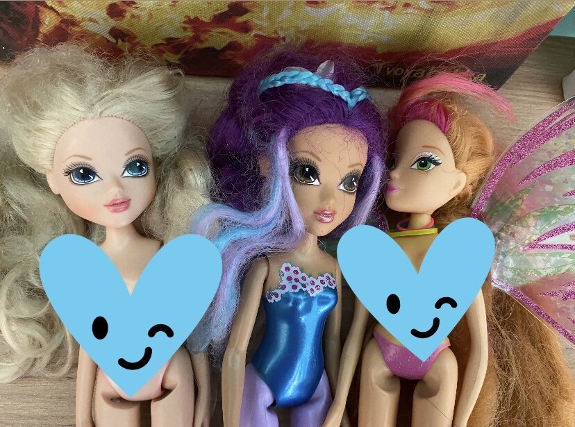Все малышки приехали голыми - босыми и с мочалистой шевелюрой. Одна даже оказалась чем-то вроде феи, правда, без крыльев. Вторую, боюсь, опознать на 100% не получится - все выпуски Эйвери практически идентичны. А вот с Винкс я не знакома вообще. Никогда у меня их не было, да и приехавшая барышня вызывает вопросы. Печать кривоватая, что со всем этим делать, я пока не знаю (зато у нее крылья есть 😁)