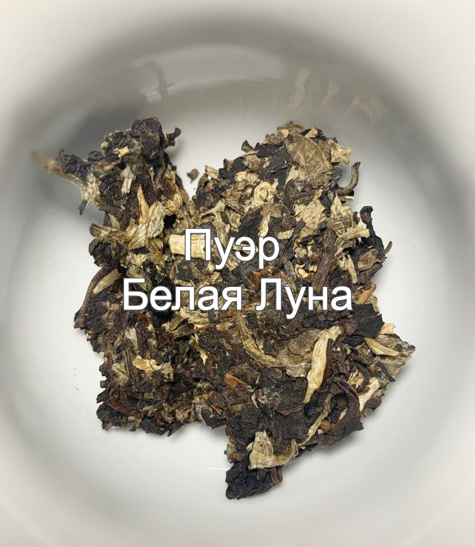 Пуэр «Белая луна» — это смесь чёрного и белого Пуэра. Этот сорт чая сочетает в себе характеристики обоих видов Пуэра, создавая уникальный вкус и аромат. Этот сорт пуэра производится в провинции Юньнань на юге Китая. Для его изготовления используются листья старых чайных деревьев. Пуэр «Белая Луна» имеет выдержку от 3 до 5 лет. Этот сорт не особо популярен, в интернете мало информации удалось найти, поэтому буду опираться только на свое знакомство с ним. Мое знакомство с Пуэром «Белая луна». Дело было вечером, открыла свои запасы и обнаружила данную находку. Прочитав на этикетке "Белая Луна", решила, что это что-то из улунов, отлично подойдет для расслабления перед сном. Боже, как я ошиблась. Даже доставая из пакета, я не обратила внимание на спрессованные куски, что в первую очередь дает подсказку - Дорогая! Это может быть пуэр! Хочется отметить, что чайные листы очень красивые, изучая фотографии видно, как переплетается светлый и темный Пуэр, создавая ощущения Инь и Ян. Заваривая его