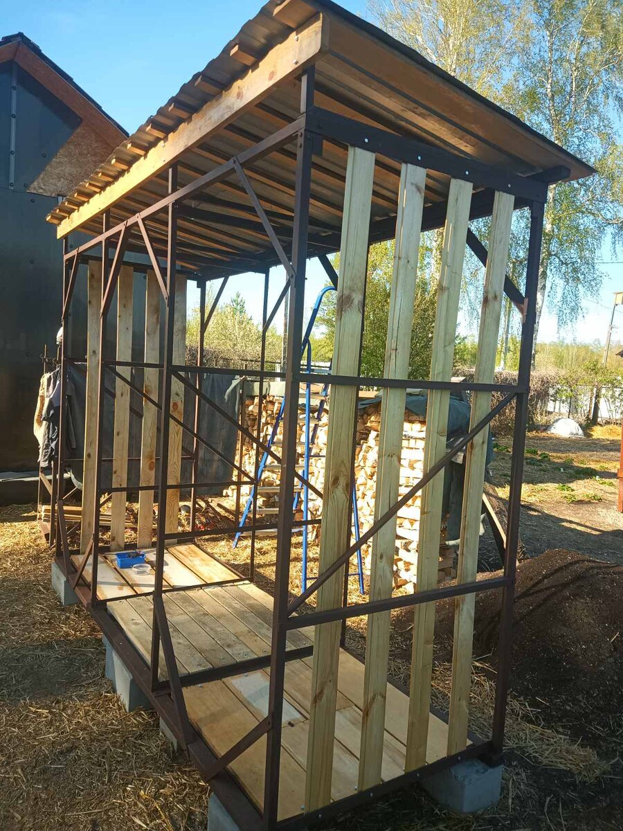 Габариты 3х1 м, высота 2 м. "Пол" выполнен на базе рамы из уголка 40х40, посередине еще доп связь из профильной трубы, далее фанера толщиной 22мм, и доска 100х25 мм. "Пол" опирается на фундаментные блоки, тем самым, вес дров по максимуму передается на землю, а не на каркас. Окончательные чертежи выполню позднее Начало тут ...