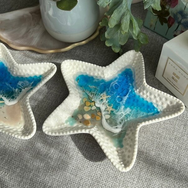 Это тоже сервировочные тарелки. Очень милые. Тоже сделаны их фарфора. Ракушка - 25,2*15,5*2,5 см. Звездочка - 19,8*19*2,6 см.