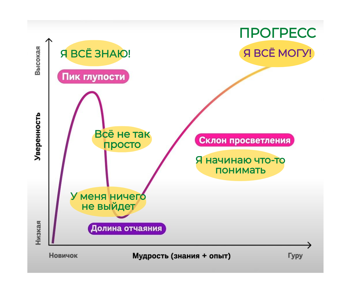 Я её сделала на основе эффекта Даннинга - Крюгера. Она наглядно показывает путь начинающего. Но, по большому счёту, она отражает жизненный путь в принципе. Эффект Даннинга-Крюгера — это когнитивное искажение, при котором люди с низким уровнем знаний переоценивают свою компетентность. В то же время квалифицированные специалисты склонны недооценивать свои способности. ...люди с низким уровнем знаний переоценивают свою компетентность... Звучит как-то слегка унизительно, согласны? Как коуч, я бы сказала так: