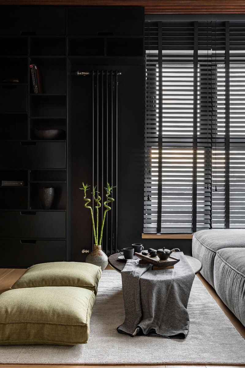 Так, мягкий диван при желании можно легко и просто превратить в полноценную двуспальную кровать. Самым сложным и важным местом в реализации проекта была чайная зона с подиумом — она стала центром квартиры и воплотила в себе колорит японской культуры.