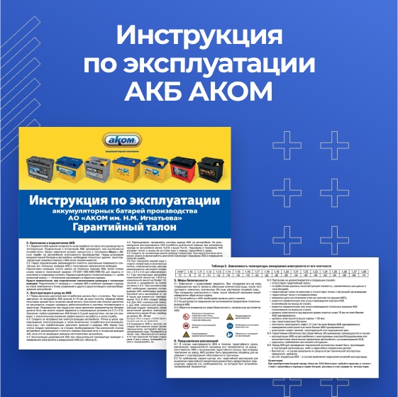 Но если дело касается стартерной аккумуляторной батареи, то важно понимать, что нюансы ввода в эксплуатацию и правильное регулярное обслуживание просто необходимы для корректной и долгой ее работы. Иначе батарея может выйти из строя очень быстро, либо изначально снизить свой ресурс. Другой момент: многие автолюбители уверенны в знании основ обслуживания АКБ и никогда не сверяются с рекомендациями завода-изготовителя. Это также неверно, так как на сегодня существует множество типов батарей с применением различных технологий, которые имеют важные нюансы эксплуатации, заряда и замера показателей. Приятно, что наши потребители часто уточняют у нас вопросы обслуживания, однако хотелось бы напомнить, что на АКБ производства завода “АКОМ имени Н.М. Игнатьева” при продаже всегда предоставляется инструкция по эксплуатации (совмещена с гарантийным тало