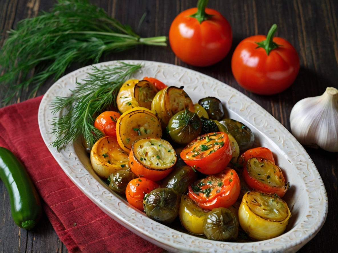 Это оригинальный рецепт гарнира, который сочетает в себе различные овощи, маринованные в ароматном чесночном соусе. Он идеально подходит для сопровождения различных блюд, таких как мясные, рыбные или овощные основные блюда. Ингредиенты Процесс приготовления Полезность ингредиентов Калорийность Калорийность в 100 граммах блюда составляет 120 ккал. Соотношение белков, жиров и углеводов Дополнения для улучшения вкуса Кулинария от АИ Магия Гарниров Запечённые овощи в чесночном маринаде