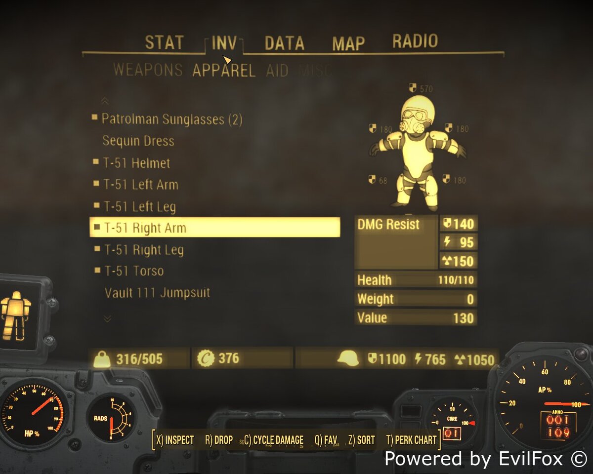 "Улучшение каждой из частей (T-51b, Т-51c и т. д.) добавляет примерно +20 сопротивления урону и энергии, и +15 hp, как в ванили (+60 hp для частей туловища) до последних нескольких обновлений. Подходит для всех комплектов силовой брони.