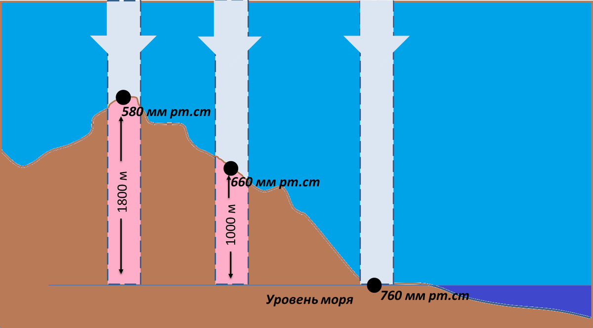 На земную поверхность давит сила находящегося выше столба атмосферно воздуха. Чем меньше высота этого столба, тем меньше величина атмосферного давления. Отсюда следует то, что с высотой атмосферное давление понижается: в среднем на 1 мм рт. ст. на каждые 10 м.
