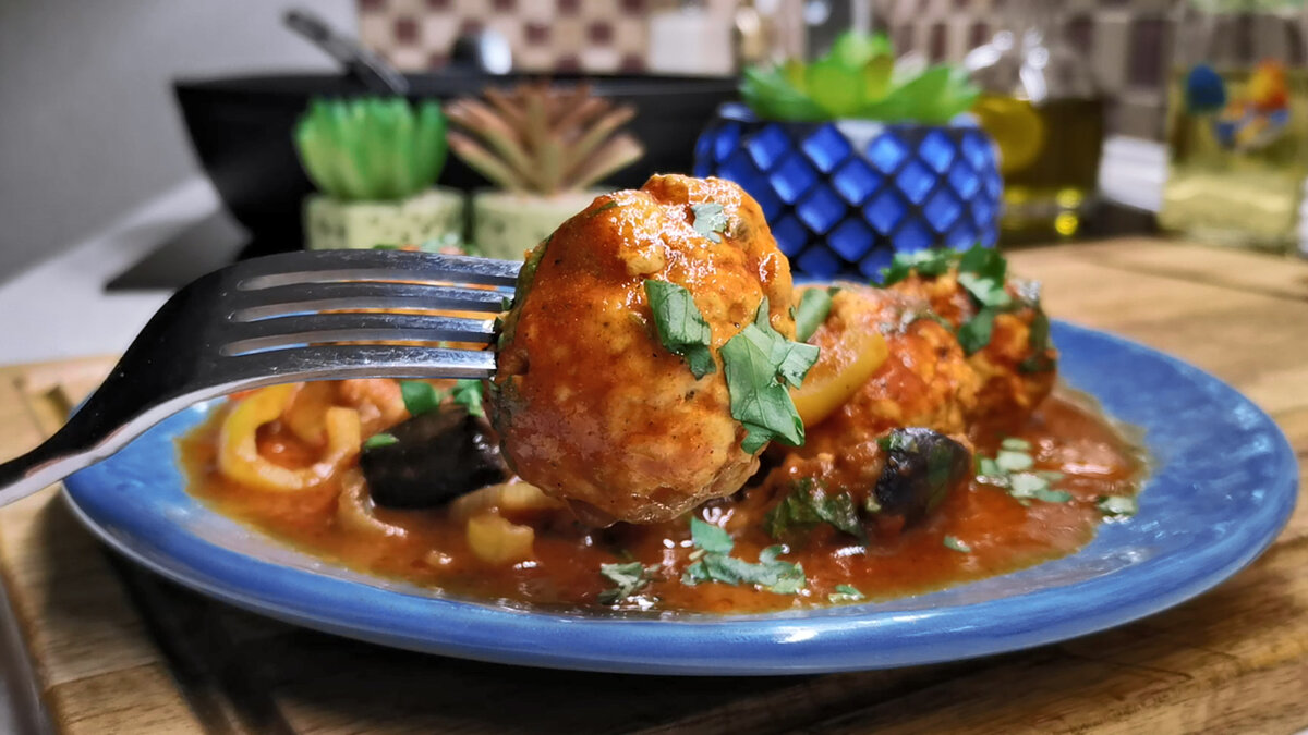 Возвращаемся к сковороде. В ней уже поджарены овощи. Выкладываем прямо на них (или в них) наши фрикадельки и сразу заливаем соусом.