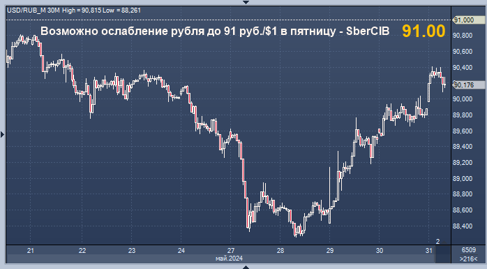 Курс доллар/рубля на Мосбирже интервалами в 1 минуту Курс доллар/рубля на Forex интервалами в 4 часа Возможно ослабление рубля по отношению к доллару США до уровня 91 руб./$1 на торгах в пятницу на фоне вероятного достаточно сильного спроса на валюту перед выходными днями, говорится в аналитическом материале SberCIB Investment Research. "По нашим оценкам, цена нефти марки Brent в пятницу может остаться в интервале $81-82 за баррель", - указывают эксперты инвестбанка. "Рынок госдолга в четверг продолжил переоценивать вероятность ужесточения риторики ЦБ РФ на предстоящем в июне заседании. На этом фоне доходности прибавили еще 10 базисных пунктов и приблизились к отметке 15% в долгосрочном сегменте. Мы допускаем, что в пятницу доходности могут стабилизироваться около этого уровня", - пишут аналитики SberCIB. Настоящее сообщение содержит мнение специалистов инвестиционной компании или банка, полученное Интерфаксом. Такое мнение предоставляется исключительно для целей ознакомления и не явля