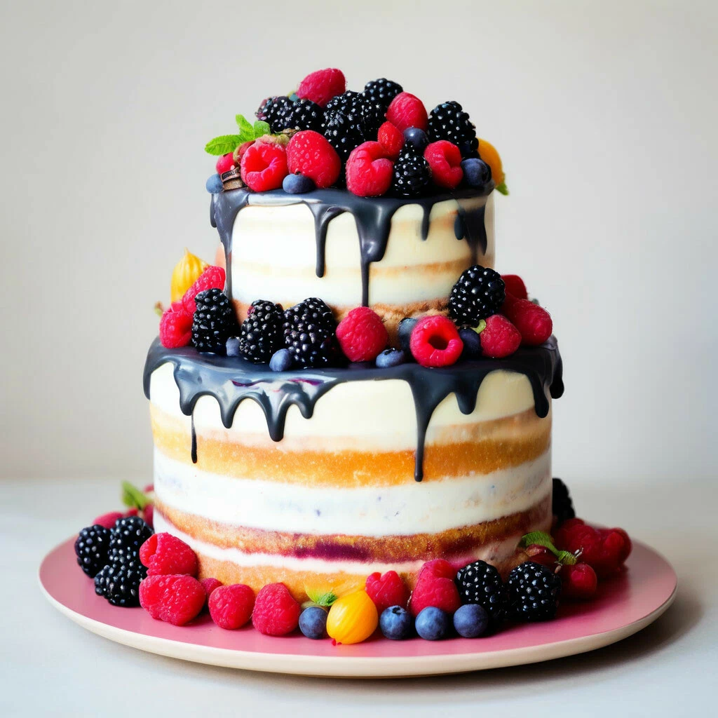 Торт был приличного размера и состоял из двух ярусов, которые были украшены разными ягодами.