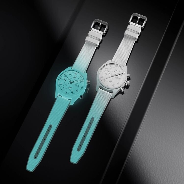 Часовой бренд создал уникальный материал Ceralume – это светящаяся керамика, полученная в результате соединения керамического порошка с Super-LumiNova. Благодаря этой смеси удалось достичь необычного свечения, которое сохраняется на протяжении суток. Стильные часы Pilot’s Watch Chronograph 41 оснащены каучуковым ремешком, которые также светятся в темноте. Ярким свечением обладает и латунный циферблат, покрытый раствором Super-LumiNova.