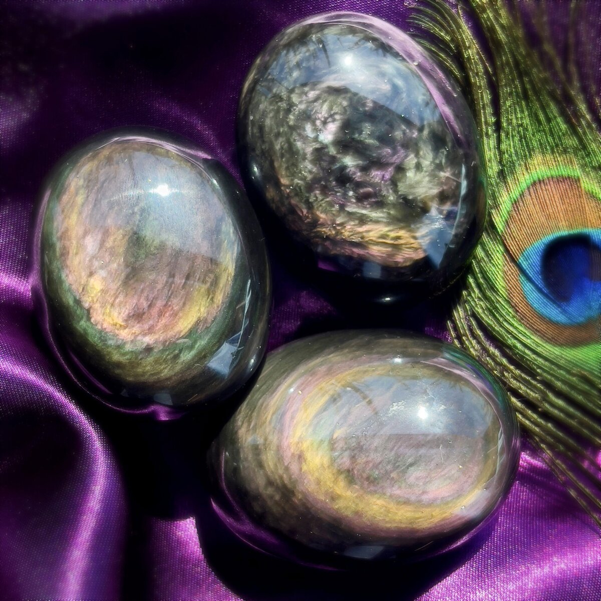 Бархатный обсидиан — редкая разновидность обсидиана. Это материал глубокого черного цвета с бархатистыми переливами зеленых, красных, синих, фиолетовых и оранжевых оттенков, которые проявляются при опадании света. Этот мерцающий эффект, называемый радужностью , вызван крошечными включениями внутри камня. Однако, бархатистый блеск является результатом уникальной текстуры поверхности камня, которая рассеивает свет таким образом, что создает мягкий, бархатистый вид. Обсидиан — это вулканическое стекло, образующееся при быстром охлаждении лавы, препятствующее образованию кристаллов. Когда лава остывает очень быстро, она не успевает кристаллизоваться, в результате чего получается гладкая, стеклянная обсидиановая порода. Считается, что бархатный обсидиан обладает защитными свойствами и часто используется в метафизических практиках. Говорят, что он помогает рассеять негатив, уменьшить стресс и улучшить эмоциональное благополучие. Некоторые люди также верят, что бархатный обсидиан может сти