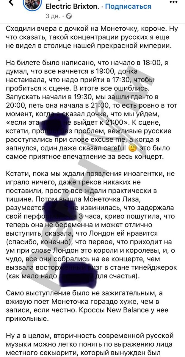 На билете было написано, что начало в 18:00, я думал, что все начнется в 19:00, дочка настаивала, что надо прийти в 17:30, чтобы пробиться к сцене. В итоге все ошиблись. Запускать начали в 19:30, мы зашли где-то в 20:00, петь она начала в 21:00, то есть ровно в тот момент, когда я сказал дочке, что мы уйдем, «если эта ... (женский половой орган) не выйдет к 21:00», - поделился у себя в соцсетях впечатлениями от концерта иноагента Монеточки русский британец по имени Сергей. Отзыв получился совсем не по британски многословным и местами матерным. "Кстати, пока мы ждали появления иноагентки, не играло ничего, даже треков никаких не поставили, просто все ждали практически в тишине. Потом вышла Монеточка Лиза, разумеется, (вообще) не извинилась, что задержала свой перформанс на 3 часа, криво пошутила, что теперь она не беременна и может отлично выступит
