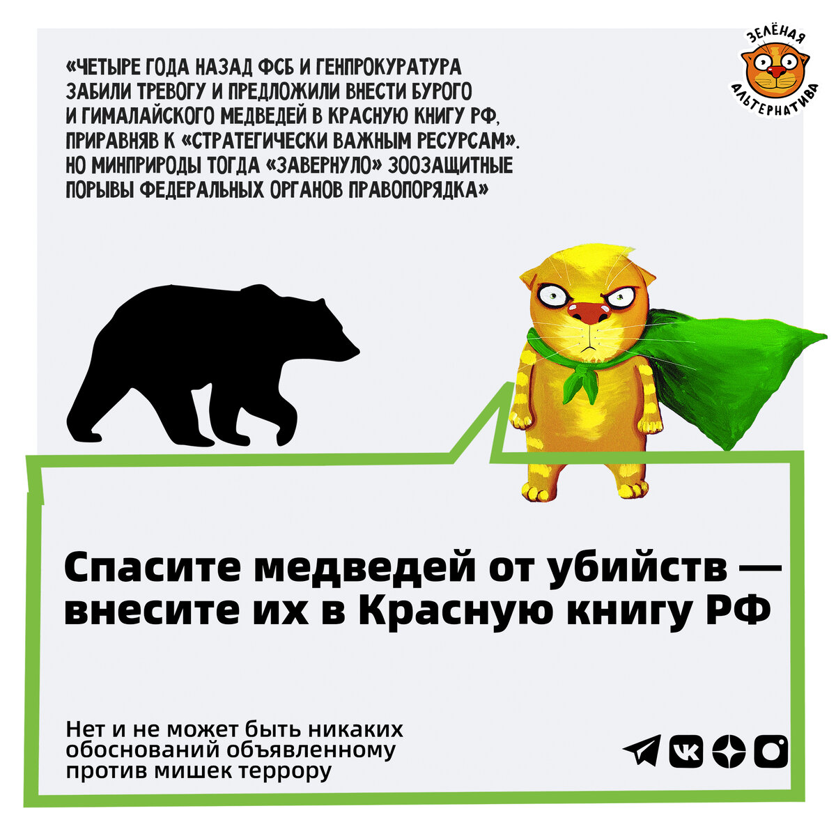 «Зелёная Альтернатива» призывает отменить живодёрский проект и занести бурых медведей в Красную книгу РФ.