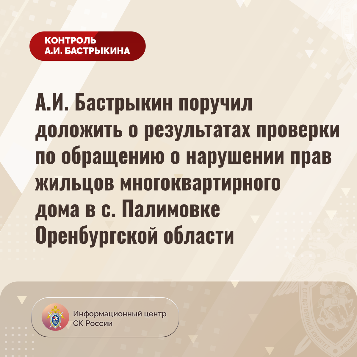 А.И. Бастрыкин поручил доложить о результатах проверки по обращению о нарушении прав жильцов многоквартирного дома в с. Палимовке Оренбургской области