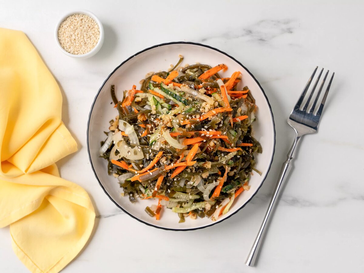 В этом витаминном и низкокалорийном салате из свежих овощей много достоинств. Добавьте к овощам морскую капусту и соевый соус, и тогда салат станет еще вкуснее и полезнее. А грецкие орехи и оливковое масло сделают блюдо питательнее. Ингредиенты: Для подачи: Приготовление: Украсьте готовый салат белым кунжутом. Приятного аппетта!
