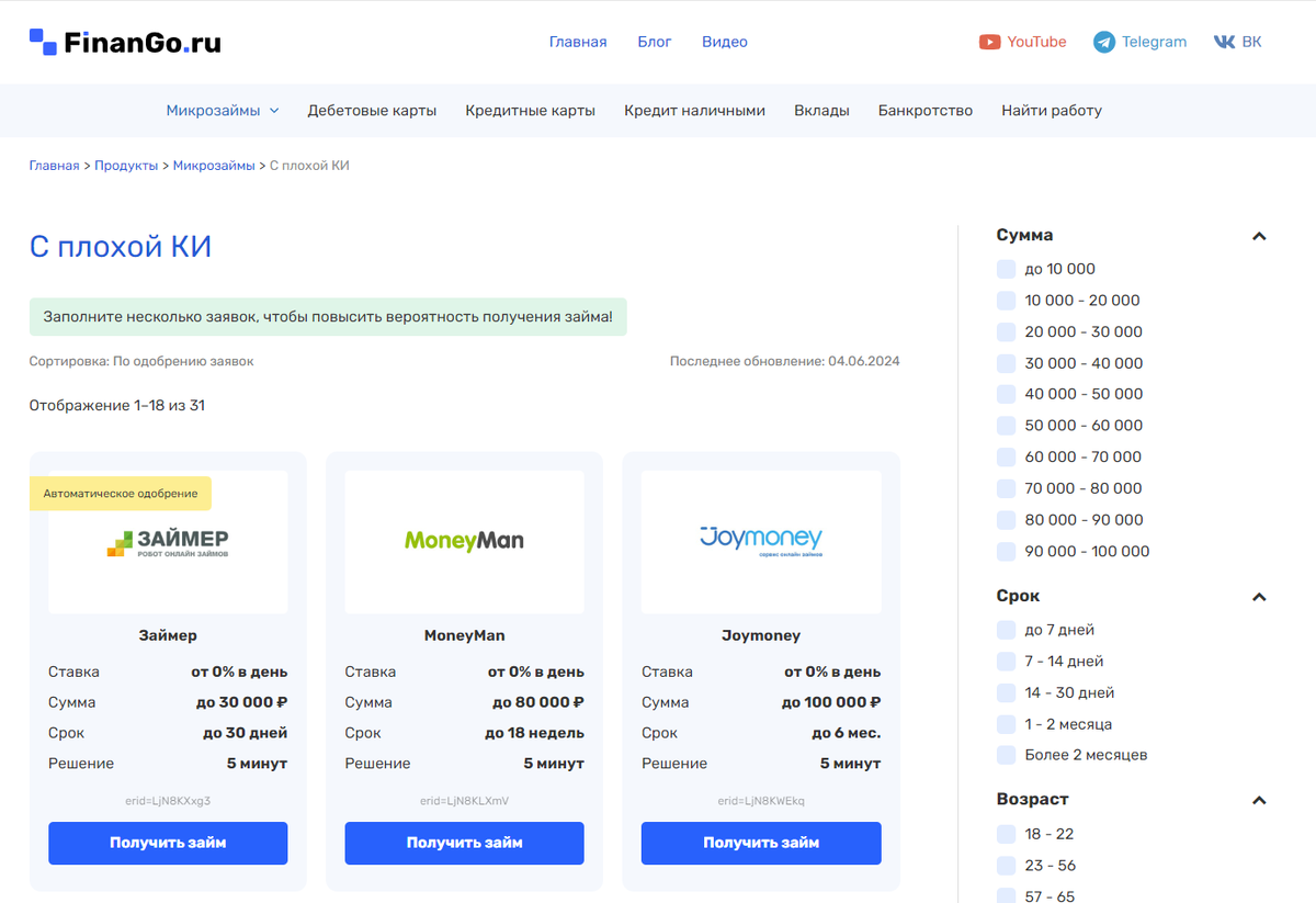 Переходим в каталог сайта FinanGo.ru на вкладку «С плохой КИ».