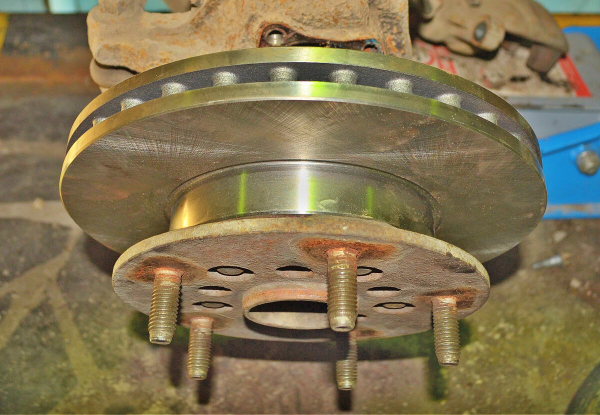 Далее, нужно путём вращения диска совместить данные отверстия с болтами крепления ступицы. там грязь и их плохо видно, так как они примерно 4-5 см. от диска.