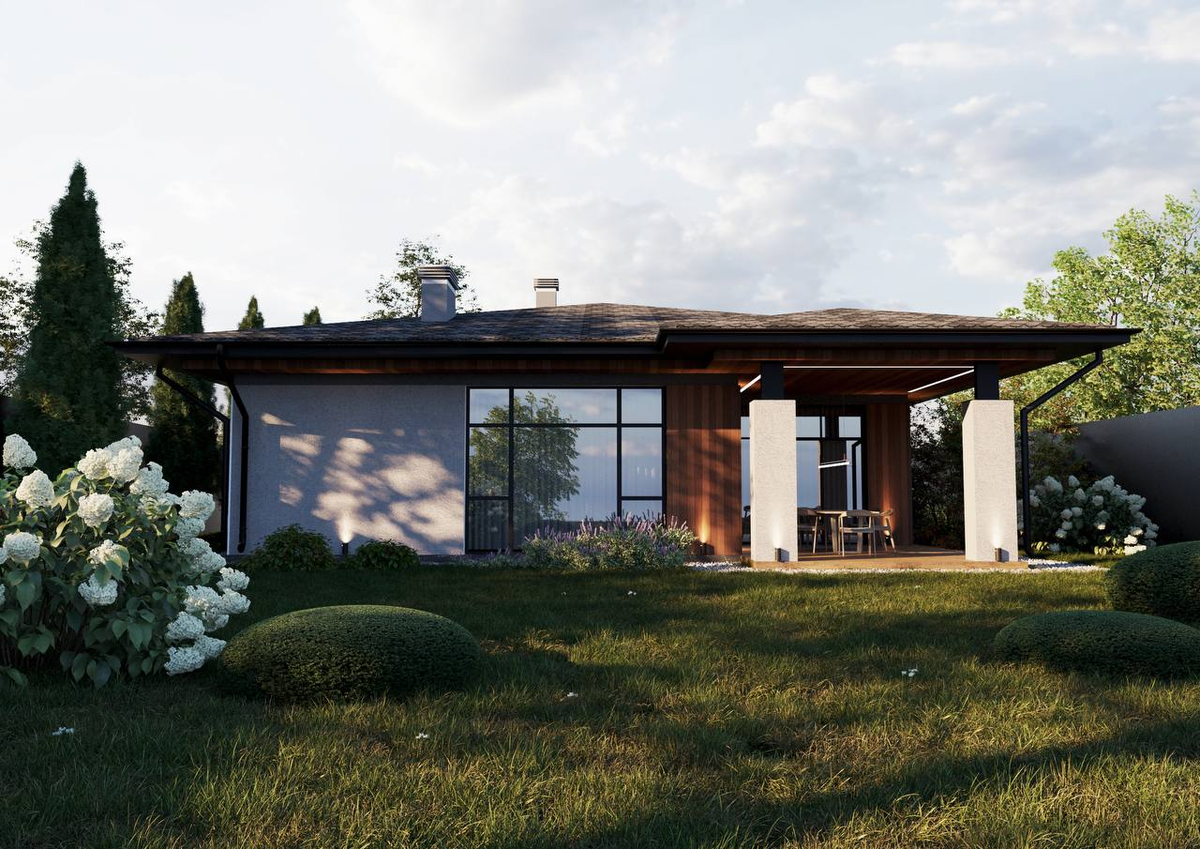 Когда мы только начали работу с заказчиком, он планировал дом площадью около 150 кв. м, а в итоге проект вырос до 207 кв. м. Это обычная практика: люди часто планируют дом, как квартиру — комнаты, гостиная, кухня, санузел, гардеробная. Но частному дому нужна автономная система обогрева и топочное помещение для неё, нужно место для хранения садового инвентаря и мебели. Всё это требует дополнительных площадей. Внутри дома будут расположены: мастер-спальня с отдельными санузлом и гардеробной, две детские, гостевая спальня, ещё один санузел и гардеробная, кухня-гостиная, а также топочная и постирочная. Кроме дома на участке будет построен гараж на два автомобиля, а под ним — погреб, который заказчик планирует использовать для хранения вин. В отделке мы использовали штукатурку двух цветов — тёмно-серую и молочно-белую, деревянный планкен. Скатная крыша будет покрыта мягкой битумной черепицей. __