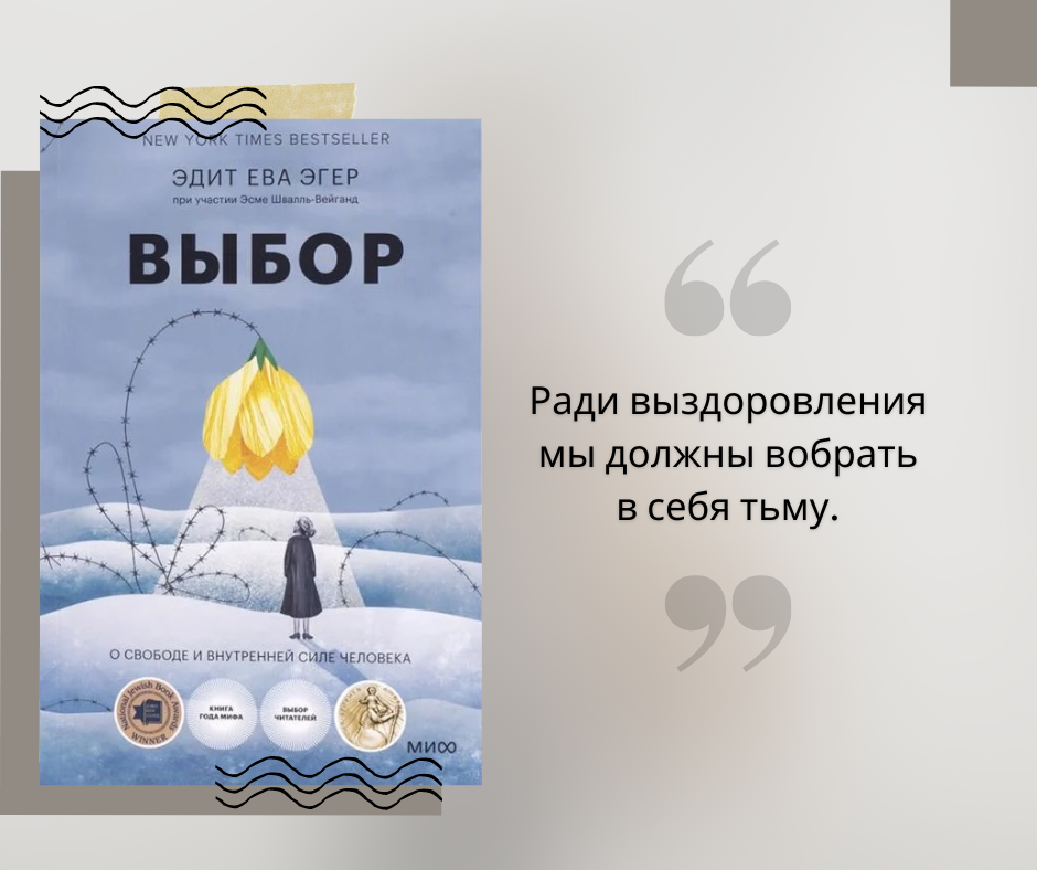 Книга «Выбор» давно была у меня на слуху, но все, что я знала — это что Эдит Эгер пережила лагерь смерти Аушвиц (он же Освенцим). Поэтому я ждала истории выжившего, которых я прочитала уже немало. Но получила… Не то чтобы не это, но, скорее, далеко не только это. Штука в том, что Эдит Эгер — доктор психологии. И ее книга — не о том, как ужасно было в лагере, а о том, как пережить свои собственные беды. Не нам выбирать, изгнать ли тьму, но в в наших силах разжечь огонь. «Выбор» — большей частью автобиография, в которой автор рассказывает о своем детстве, взрослении, заключении в лагере, эмиграции, личном и профессиональном развитии. При этом каждый этап оценивается ей с высоты прожитого опыта, и благодаря этому читатель может многому научиться. Но обо всем по-порядку. Эдит родилась на территории современной Словакии в венгерской еврейской семье, у нее было две сестры — красавицы и умницы, а она — самая младшая, отчаянно и безуспешно добивающаяся внимания матери. Но Эдит нашла свою страс