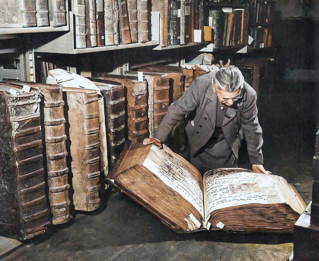 Продолжаю публиковать интересные и необычные фотографии, которые были сделаны в XХ веке и в конце XIX в разных странах мира. Всё снимки были раскрашены и прошли через реставрацию. Изучение прошлого помогает нам понять современность и примерно представлять, что ждет нас через несколько десятилетий. Именно по этой причине мы очень любим рассматривать старые фотографии, ведь они лучше всего показывают прошлое и помогают понять, насколько сильно изменился наш мир. Библиотека в Пражском замке, 1950 год. Судя по размеру книг, в замке обитали великаны. Вполне возможно, что большие книги делали неспроста. Такие размеры обеспечивали точность написанных узоров и букв, к тому же обработка и создание маленьких книг очень трудоëмкая работа.