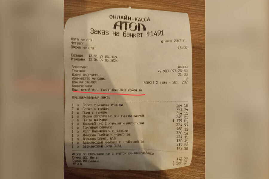 «Говнокорпорат какой-то». Такую надпись в чеке заметили посетительницы, забронировавшие зал для проведения мероприятия. В Челябинске гостям ресторана был выдан чек, в котором их мероприятие было названо "говнокорпоратом". Об этом пишет издание "КП-Челябинск". Сообщается, что инцидент произошел в ресторане под названием "По Чесноку". Одна из женщин рассказала, что они с коллегами пришли в заведение для бронирования корпоративного мероприятия в июне. Гости оплатили заказ заранее и получили чек. Однако на документе они увидели необычную надпись от одного сотрудника другому. «Юля, мужайтесь, говнокорпорат какой-то»,- было написано в чеке. Одна из посетительниц поделилась своим негодованием по поводу произошедшего инцидента в социальных сетях. Руководство ресторана немедленно отреагировало на недовольство клиентов и в качестве извинения предложило им депозит в размере десяти тысяч рублей, который можно использовать в ресторане. Кроме того, сотрудника, написавшего оскорбительное сообщение, у