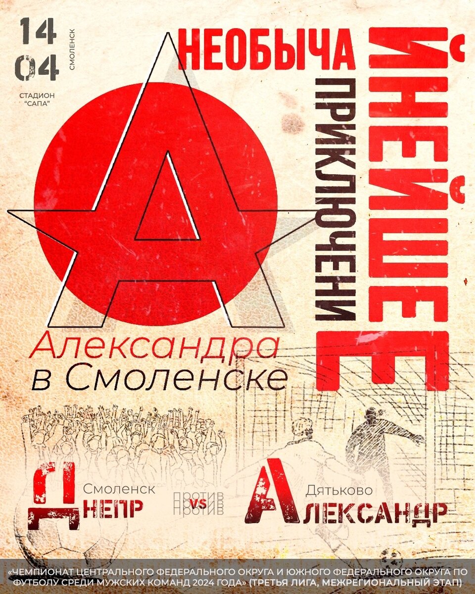 Футбольный клуб «Александр» - дебютант первенства России среди команд Третьей лиги, но на каждый матч турнира готовил афиши, стилизованные под сопутствующие или переплетающиеся с игрой события и факты.