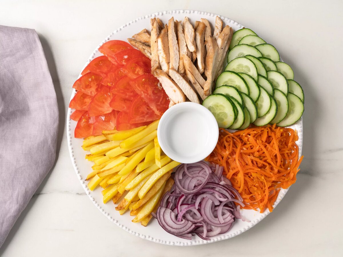 Правильно приготовленная шаурма не просто насытит, но и сбалансирует белки, жиры и углеводы в одном блюде. А если не заворачивать курицу и овощи в лаваш, а разложить их на тарелке, то получится быстрее и красивее. Тонкий лаваш или питу можно подать отдельно, чтобы собрать шаурму на свой вкус из любимых ингредиентов. Ингредиенты: Для подачи: Приготовление: Подайте к ленивой шаурме тонкий лаваш, чтобы заворачивать в него начинку по своему вкусу. Приятного аппетита!