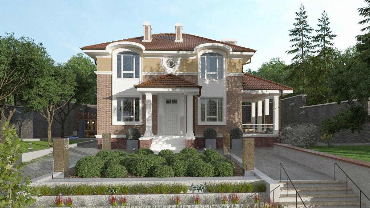 Внешний вид коттеджа «Хилтон» отделан с использованием декоративной штукатурки и облицовочного кирпича пастельных тонов. Особый акцент сделан на окна второго этажа, подчеркнутые арочными фронтонами. Со стороны двора фасад декорирован лепниной. С правой стороны расположена крытая терраса с барбекю, на которой будет приятно собраться с друзьями и вкусить яства на свежем воздухе, наслаждаясь благоуханием цветов и пением птиц. Этот четырехкомнатный дом станет тихим и уютным гнездышком для большой и дружной семьи. Если Вы стремитесь создать максимально комфортные условия для своих домочадцев, то этот коттедж станет для Вас прекрасным вариантом. Планировка Площадь дома - 128 кв.м.