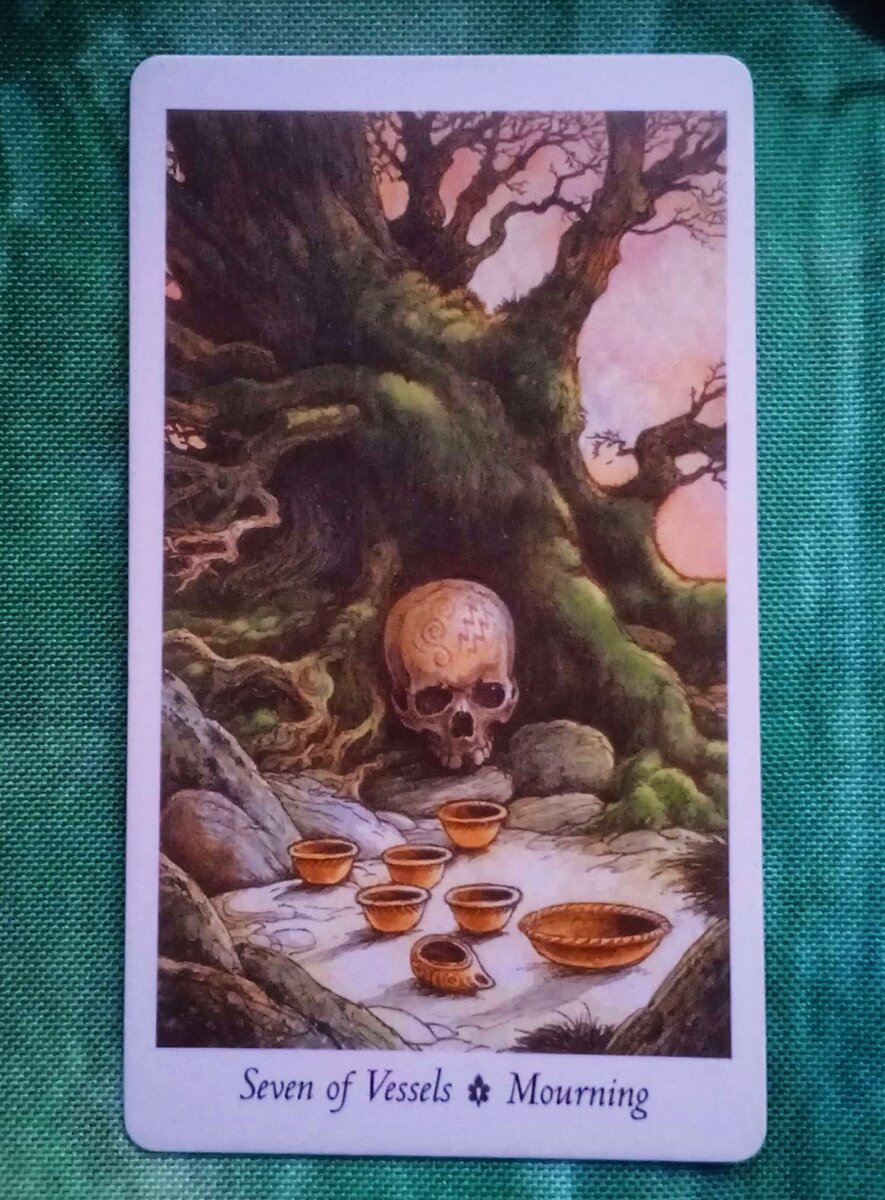 Здравствуйте, дорогие читатели. Сегодня мы разберём значение следующей карты и узнаем, какие энергии будут сопровождать нас в течение этой субботы - 1 июня. Карта Семёрка Чаш или Утро. Карта Таро 7 Чаш из колоды Секреты Природы несёт в себе глубокий и многогранный смысл. На рисунке изображён череп в корнях могучего дуба, перед которым на каменной плите стоят жертвенные чаши. А в небе алеет восход, освещая эту мистерию. Что означают эти символы? Череп, лежащий в корнях древнего дуба, символизирует мудрость, устойчивость и вечность, сопряжённые с циклами жизни и смерти. Корни дуба, обвивающие череп, напоминают о том, что все мы являемся частью более крупного цикла природы и взаимосвязаны с миром вокруг нас. Жертвенные чаши на каменной плите перед дубом отражают духовные жертвоприношения и поиски глубинного содержания жизни. Они могут говорить о необходимости отказа от устаревших убеждений или жизненных сценариев в пользу чего-то более значимого и подлинного. Восход, алеющий в небе и осв