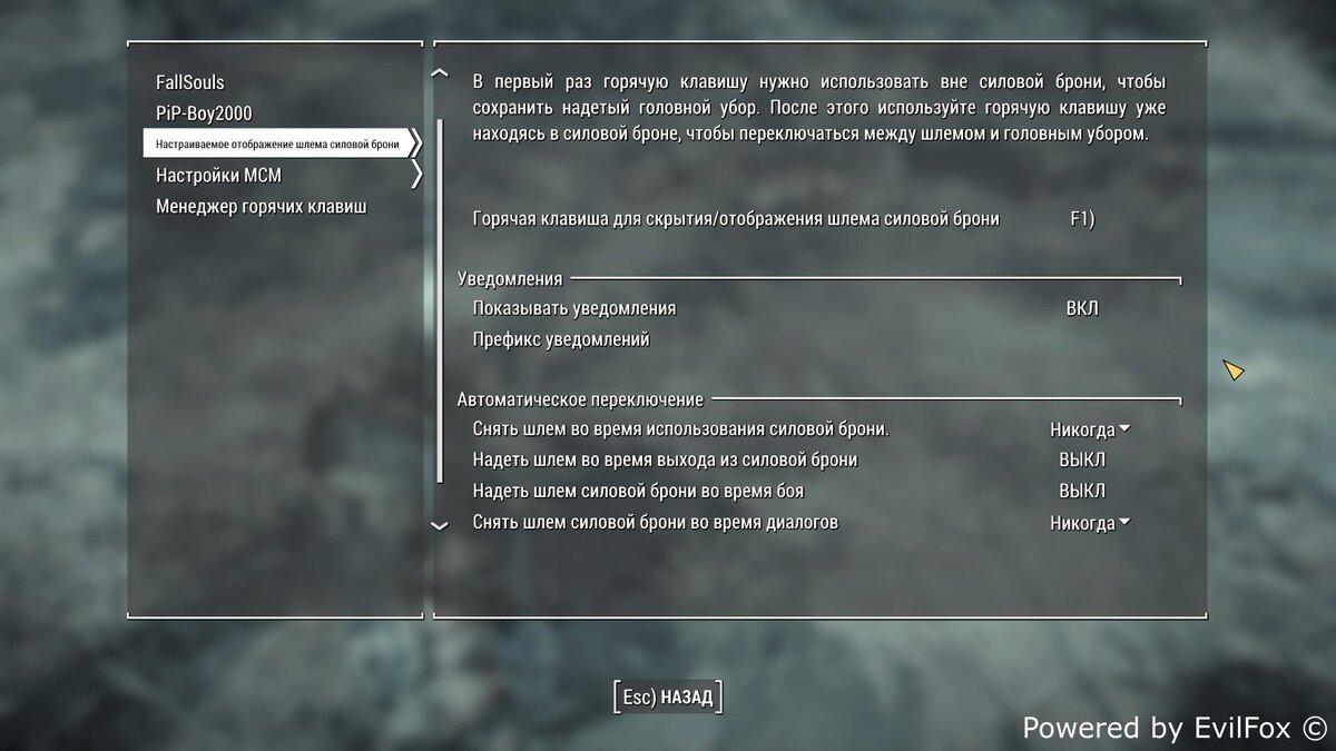В первый раз горячую клавишу нужно использовать вне силовой брони, чтобы сохранить надетый головной убор. После этого используйте горячую клавишу уже находясь в силовой броне, чтобы переключаться между шлемом и головным убором. Также работает в диалогах.