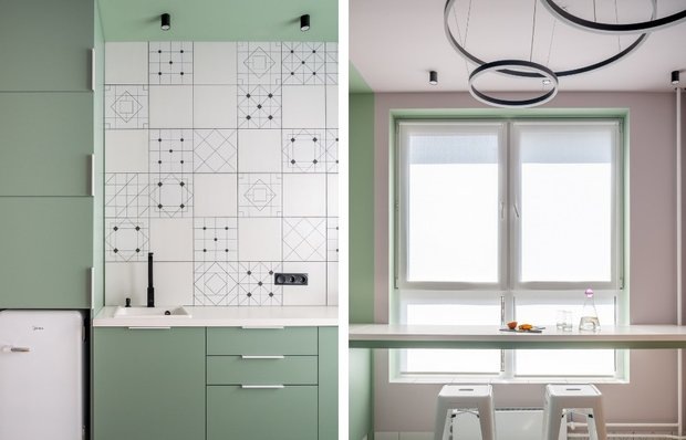 Дизайнер сделала из однушки две полноценные студии, и в каждой нашлось место для кухни Дизайнер Ника Чередникова превратила однокомнатную квартиру площадью 34 кв. м в две студии. Одним из пожеланий заказчика были кухни-гостиные в каждом жилье: Ника справилась с задачей и продумала одновременно стильные и функциональные пространства, где эффективно использован каждый сантиметр. Рассказываем про потрясающую кухню в зеленом оттенке с необычным фартуком – вдохновляйтесь и повторяйте интересные решения. Цвет фасадов кухни выбрали зеленый: из краски сделали окантовку, чтобы выделить ее. Фасады выполнены из ЛДСП, столешница изготовлена из компакт-плиты. При организации хранения сделать две ниши не получалось (именно такое решение реализовано на первой кухне в первой студии), поэтому здесь оформили только одну. Ника забрала немного места от кухни и сделала платяной шкаф – в нем хранится одежда. А по соседству с ним находится кухонная зона. Нашлось место и для небольшого холодильника, и для СВЧ