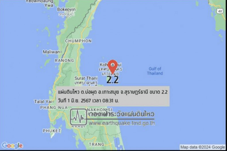 В субботу на Самуи в провинции Сурат Тани было зарегистрировано землетрясение магнитудой 2,2 балла по шкале Рихтера.