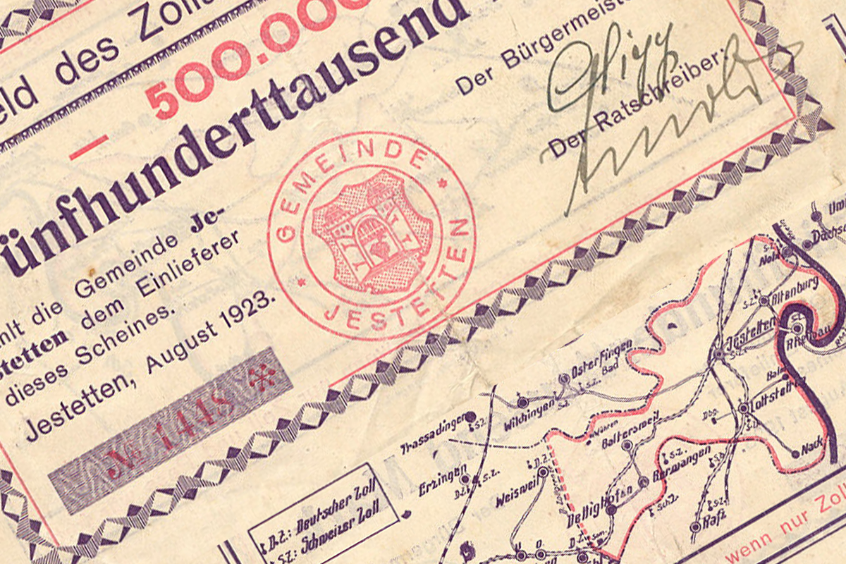 Банкнота в 500 000 марок муниципалитета Йештетен от августа 1923 года с надписью "Чрезвычайные деньги таможенного комитета" — что это? 500 000 марок звучит так много, но в то время это было всего четверть доллара США, потому что в Германии царила гиперинфляция. Территория таможенного исключения (ZAG) Йештетена, о которой здесь идёт речь, относится к той части немецкой территории, которая находится между Нойхаузеном и Рафцем и почти полностью окружена Швейцарией. Йештеттер-Ципфель состоит из муниципалитетов Деттигхофен, Йештеттен и Лотштеттен и нескольких деревень. Район связан с Германией только узким проходом, ширина которого в среднем составляет всего около 800 метров между Рафцем и Шаффхаузен-Клетгау. Это образование возникло в результате того, что в середине XVII века обременённые долгами графы Зульц продали ландграфство Клеттгау, а именно Верхний Клеттгау, расположенный севернее, Шаффхаузену, а Рафцерфельд, расположенный южнее, Цюриху. Но небольшой участок земли между ними она сох