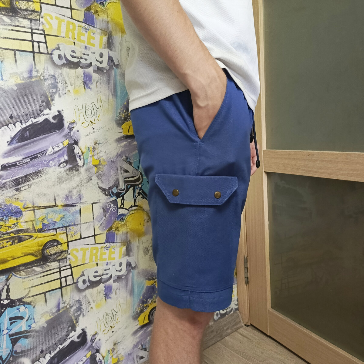 Шила я тут мужские шорты и нужно было сделать боковой карман. Мне очень хотелось, чтобы карман был с клапаном, но сделать традиционный клапан мешал передний карман - уж очень он тут глубокий. Изменить немного форму кармана я не догадалась, поэтому придумала как сделать оригинальный клапан. Идеи такой я ни у кого не видела - может кто до меня уже так делал, но тут я всё придумывала сама. Смысл в том, что начало клапана прячется внутри кармана. Т.е. линия его пришивания опущена вниз. И чтобы не было некрасивых срезов, я их закрыла киперной лентой. Для начала я выкроила сам карман и клапан. Форму клапана придумывала на ходу. Тут главное, чтобы он был Уже кармана: чтобы поместится внутрь. Затем разместила карман и клапан там, где они будут находится и зафиксировала все булавками. Нижний конец клапана должен быть спрятан в кармане. Отогнула карман вниз и пришила его по нижнему краю. Вернула в исходное положение. Закрепила булавками, но верхний край пока отогнула - чтобы не мешал. На клапан