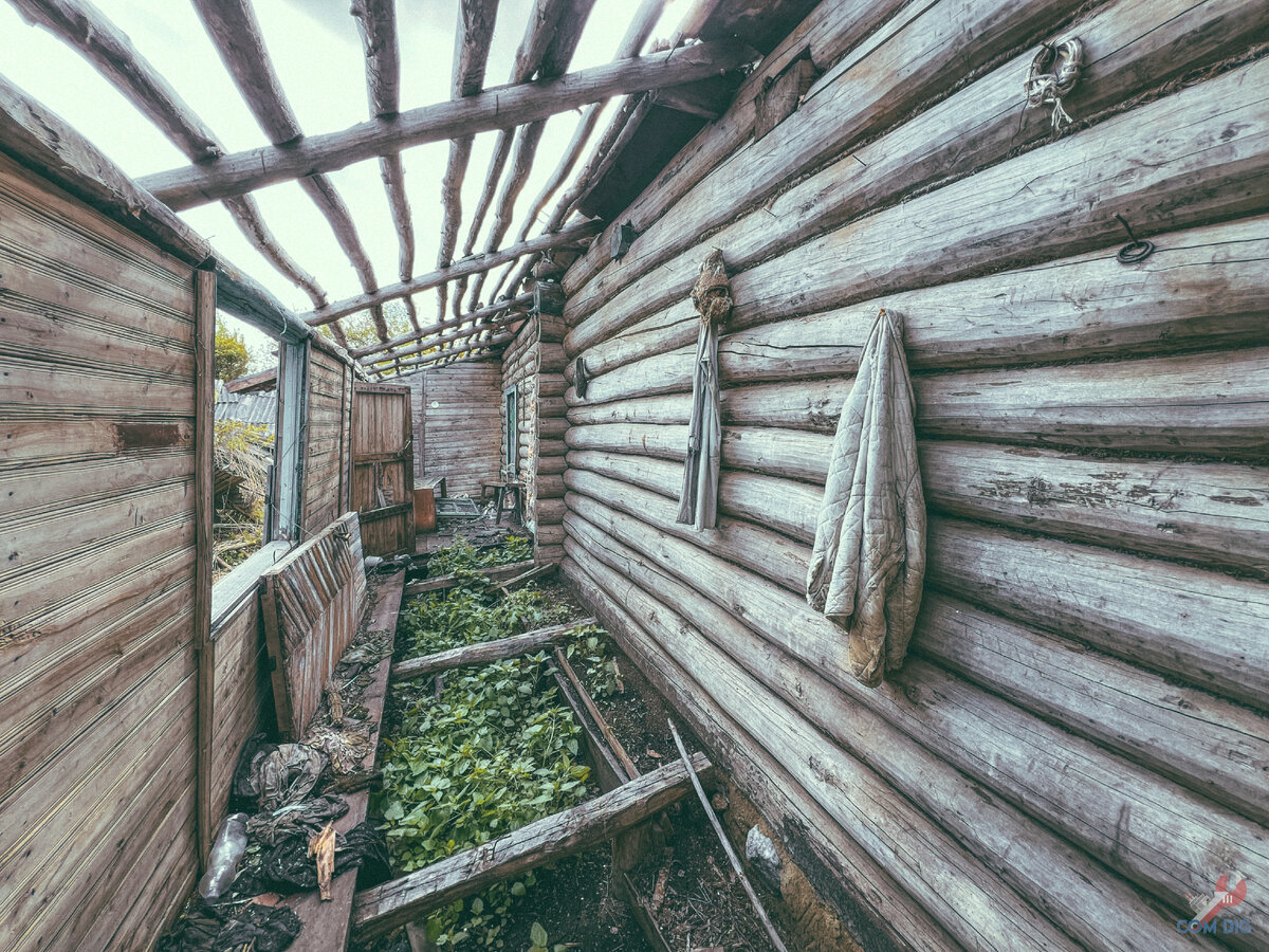 Заглядываю внутрь — а там сапоги, висящие на вешалках, брюки и куртки. Казалось, что внутри кто-то есть. От увиденного стало немного некомфортно, и я на всякий случай поздоровался и окликнул: "Есть кто-нибудь тут?" Чаще всего в таких домах могут оставаться отшельники или люди, которые решили приехать в родные места, где провели детство. Чаще всего это внуки или внучки бабушек и дедушек. Родные ушли из жизни, а дети и внуки иногда заезжают, ностальгируют по беззаботным временам, скучают по теплу и уюту деревенской атмосферы.