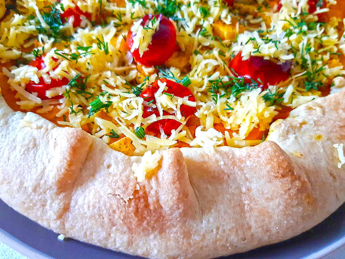 Пришлось срочно исправлять ситуацию. Посыпать открытую часть пирога тертым молодым сыром и зеленью укропа. Получилась галета в стиле пиццы🤣