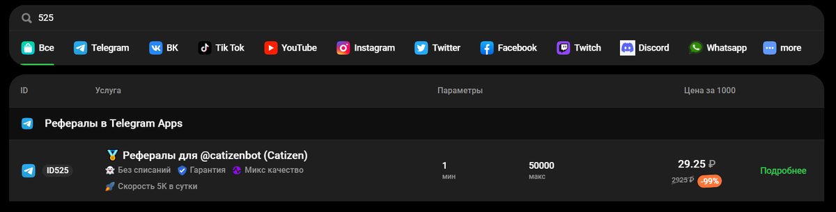регистрируемся и Вбиваем услугу ID услуги 525 запомнили? Далее подробнее Далее копируем нашу реферальную ссылку из бота Оформляем заказ Ждем Радуемся Телеграм канал https://t.me/smm_telegram_shop Поддержка 24/7 https://t.me/maksosiski Сайт https://smm-telegram.shop