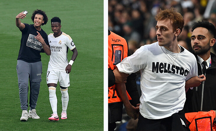 🤦♂️🤦♂️🤦♂️ Финал Лиги чемпионов на «Уэмбли», по сути, начался с задержкой, потому что на поле выбежали болельщики. Вот так сразу. Потому что нашлись персонажи, захотевшие выполнить челлендж стримера Меллстроя. Да, даже во множественном числе! Один ______ (подставьте характеристику сами) в белой футболке с черной надписью, другой ______ – в черной. Оба с одной и той же целью. Получить от стримера 30 миллионов рублей. В марте последователь Меллстроя уже выбегал на поле в матче сборной России с сербами – тоже надеялся на 30 млн рублей, хотя блогер писал только про финал Лиги чемпионов. Человек надел футболку с изображением белорусского трэш-стримера, но в итоге получил вместо денег только арест на 13 суток. Кто вообще такой этот стример? Весной мы уже рассказывали про белорусского стримера, когда привет ему передавал Килиан Мбаппе. Челленджи Меллстроя: откуда он берет деньги и чем занимается? «Килиан здесь. Просто хочу сказать тебе привет, надеюсь, у тебя все хорошо. Надеюсь, скоро у