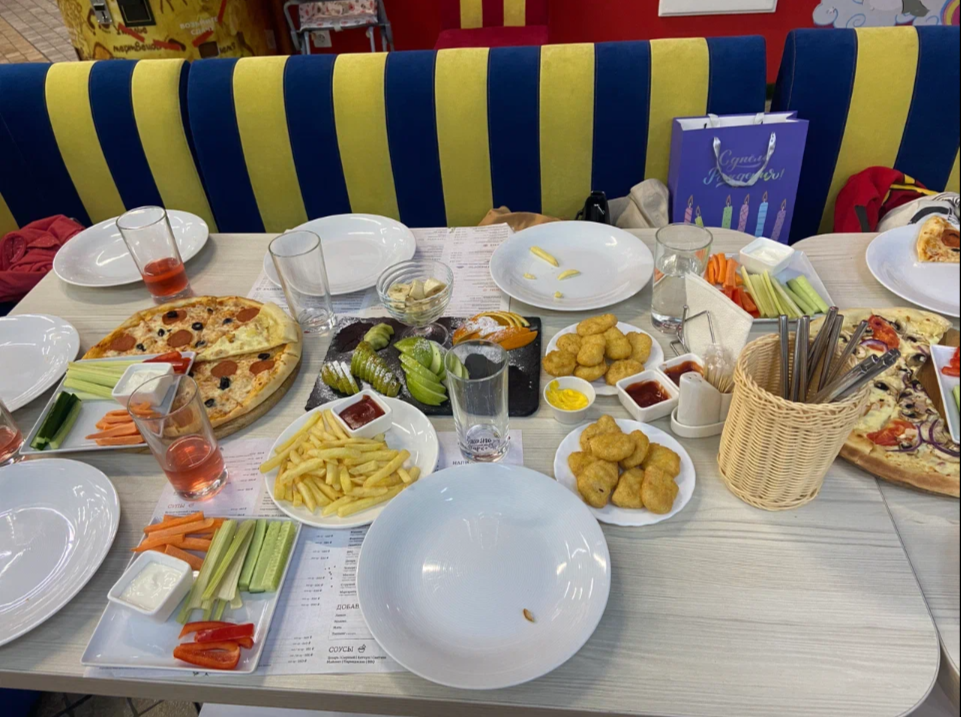 Планировать день рождения дочери я начинаю за месяц, так как дата 1 июня очень популярна, а в этом году еще и суббота. Составили список гостей, разослали приглашения, получили ответ, что обязательно будем. В итоге из 12 детей, пришли только 7 и меня никто не предупредил, что они не смогут придти. Хорошо, что я подстраховалась и изначально заказывала детскую комнату на меньшее количестве детей. На что же тратятся деньги из года в год: 1. Место проведения. Выбрали популярную детскую комнату в городе Джанго-парк. Удобно что дети играют в детской зоне, а родители сидят за большими столами и едят из нормальной посуды, а не из пластиковой. И аниматор попалась очень заводная, детям понравилась, хоть они и большие уже. На этом плюсы заканчиваются. За 8 детей заплатили 20190 руб + дополнительно наели за столом на 4000 руб. Время нахождения не ограничено, хоть целый день играй, но мы были 4,5 часа. В эту стоимость входил банкет: 3 пиццы, 8 порций картофеля фри, 8 порций наггетсов, 8 соусов (