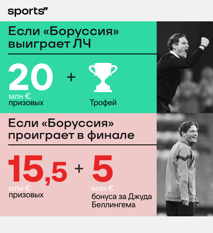 Но есть нюанс. Призовые за победу в Лиге чемпионов – не единственная возможность «Боруссии» заработать этим вечером. Дортмунды попали в уникальную ситуацию. Почему может быть выгодно проиграть? Победителю Лиги чемпионов полагается 20 млн евро призовых, второму месту – 15,5 млн евро. Первое лучше второго, что тут думать. Но... Мы помним, что Джуд Беллингем переехал в «Реал» именно из «Боруссии», и в трансферном соглашении прописан бонус на случай, если «Мадрид» с помощью англичанина выиграет в Лиге чемпионов – 5 млн евро (по данным издания Ruhr Nachrichten). Математика простая: если «Боруссия» победит, то получил 20 млн евро, если проиграет – 15,5 млн плюс 5 млн. Некоторые медиа пишут, что бонус за победу Джуда в Лиге чемпионов достигает целых 20 млн евро, но это не совсем корректно. Испанское издание Sport уточняет, что общая сумма трансфера не превысит 134 млн евро с учетом бонусов, а 20 млн – прописанные отчисления за все завоеванные трофеи (Ла Лигу и Лигу чемпионов). Есть еще бонусы