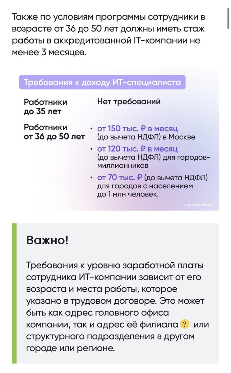 Читала я статьи в ленте и наткнулась на посты, про получение от государства денег на улучшение жилищных условий. Сколько не читала, все программны были направлены на малоимущих, либо для семей с детьми 2018 года рождения. Мой же сын родился в 2017 году и я пролетела по всем фронтам - ни мат капитала, ни семейных ипотек, ни повышенных декретных. И вот я нашла статью про выплату молодым семьям, и глаз зацепился за информацию о том, что выплата доступна не только супругам. Полезла в госуслуги читать подробности и между делом решила перейти и по ссылке с IT ипотекой. От увиденного была в шоке. Об ипотеке я знала, но видела информацию о требованиях зарплаты и думала, что я не прохожу, ибо нужно 150000р в месяц(компания зарегистрирована в Москве). Но, оказывается, для людей младше 36 лет такого требования нет, а мне то 28! Ни в одной статье я не видела этого упоминания. После информации о зарплате в статьях мне и в голову не приходило проверить полные условия через госуслуги или в банк