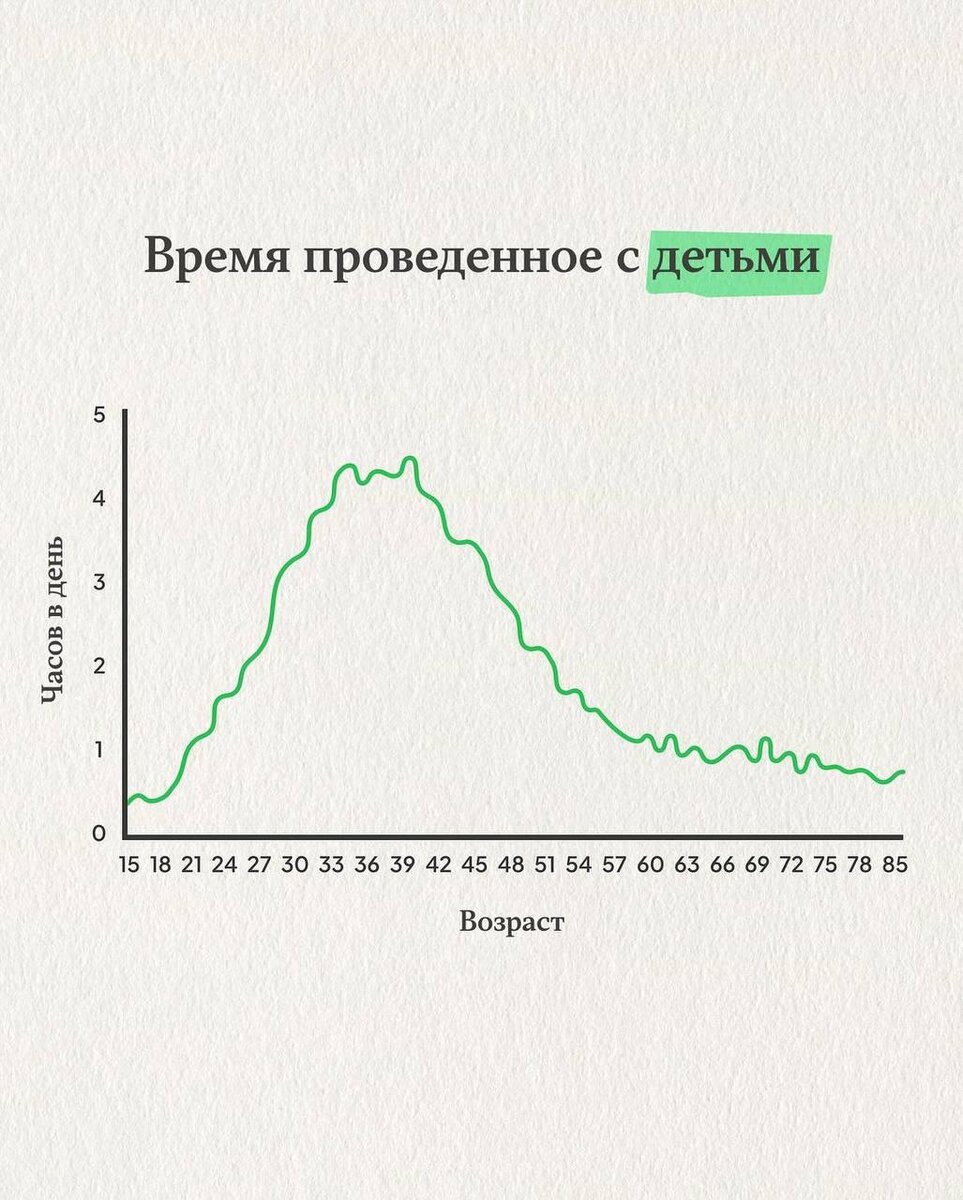 Он иллюстрирует время в часах, проведенное с детьми в зависимости от вашего возраста. Здесь мы отчетливо видим, что наибольшее количество часов, то есть от 4-5 в день, приходится на возраст от 33 до 42 лет. Дальше график резко начинает снижаться по логичным причинам: дети идут в школу, в университет, начинается сепарация и так далее. То есть у вас, по сути, есть менее 10 лет во всей своей жизни, чтобы провести максимальное количество времени со своими детьми. Также мы видим, что после 57 лет этот график стремится к нулю. То есть, скорее всего, в этом возрасте, максимум, что вы будете делать, это созваниваться по видео со своими детьми. Хорошо если раз в день или несколько раз в неделю.