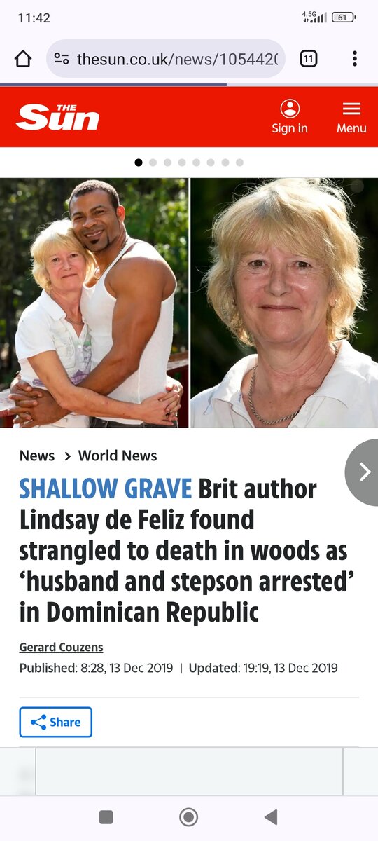 Эта история началась за 2 года до моего переезда в Доминикану и вот сегодня в нашем сообществе появилась информация, чем всё закончилось и откровенно говоря, новость шокировала. Под статьей сотня русскоязычных комментариев, многие знали жертву лично и говорят о ней как о светлом и добром человеке. Lindsey de Feliz автор нескольких бестселлеров из Великобритании, было ей 62 года и она уже много лет уже жила в Доминиканской республике. Вышла замуж за местного мужчину, у которого уже был сын от первого брака. Жили они в деревне, на северо-западе острова. Имела местное гражданство, писала книги, занималась благотворительностью, работала переводчиком и инструктором по дайвингу, а ее муж адвокатом. За время жизни в Доминикане она перенесла два нападения, причем с попыткой убийства. Первый раз в нее стреляли, это было в далеком 2006 году, пуля попала в горло, и она тогда чуть не умерла. Друзья-соседи на мотоцикле успели доставить в больницу, где ей своевременно оказали помощь. Скажем так, в
