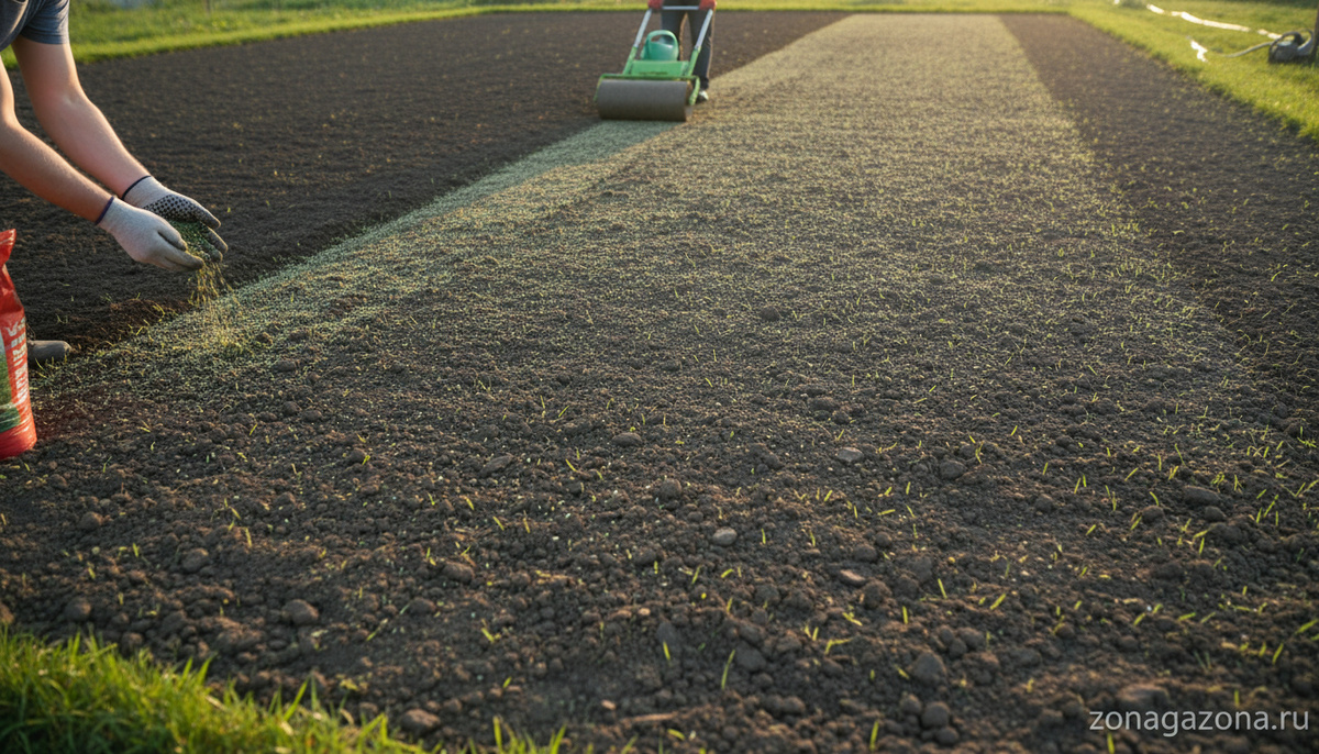 - Разбросайте посевную смесь сначала в одном направлении, затем в перпендикулярном.