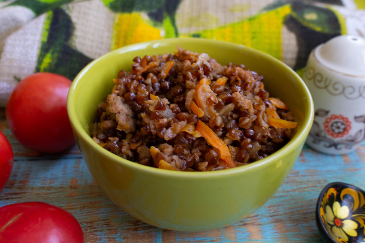 Рецепт для любителе гречневой каши. Гречка по-купечески готовится быстро и просто. Фарш для приготовления подойдет совершенно любой: говяжий, свиной, смешанный или даже куриный. Все варианты можно опробовать и выбрать наиболее понравившейся. Это блюдо простое, но очень вкусное, гречка насыщенная, сытная, пропитанная. Ингредиенты: Фарш мясной - 500 г. Гречка - 350 г. Вода - 400 мл. Лук репчатый - 2 шт. Морковь - 1 шт. Томатная паста - 2 ст.л. Масло растительное - 80 мл. Перец черный молотый - щепотка Соль - по вкусу Лук мелко нарежем, морковь натрем через крупную терку. Обжарим овощи на сковороде с разогретым маслом. Обжариваем до мягкости, помешиваем. Выложим на сковороду к овощам фарш и готовим 10 минут, помешиваем, чтобы фарш не собирался в комок. Переложим фарш с овощами с удобную посуду, кастрюлю или казан. Добавим томатную пасту. Томатную пасту можно заменить на 100 г. томатного соуса. Выложим в посуду гречку. Добавим соль и черный молотый перец по вкусу. Вливаем воду. Готовим гре
